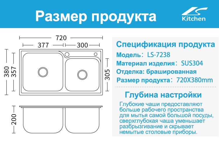 Кухонная мойка с двумя чашами и двумя отверстиями, LS-7238, производство Sink Manufacturing Factory