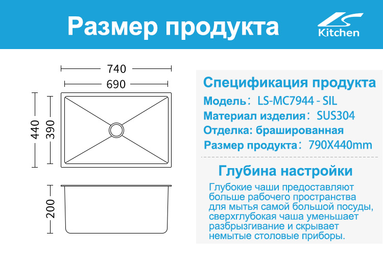 Популярная кухонная мойка для всей семьи в квартире LS-MC7444BLA с матовой антикоррозийной прямоугольной раковиной