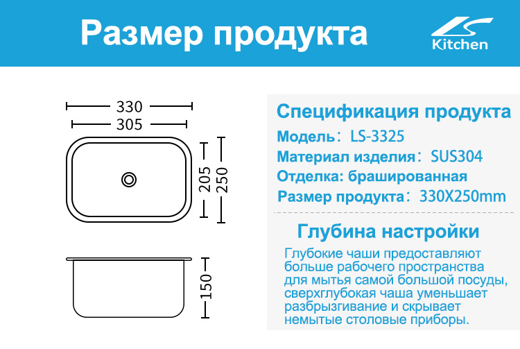 Прямоугольная кухонная раковина из нержавеющей стали 304 LS-3325 небольшого размера